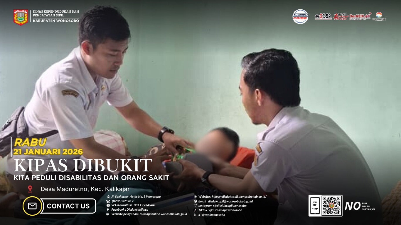Dinas Kependudukan dan Pencatatan Sipil Kabupaten Wonosobo dalam waktu lima hari ke depan akan melaksanakan pelayanan Inovasi KIPAS DIBUKIT (Kita Peduli Disabilitas dan Orang Sakit) di Kecamatan Kalikajar.