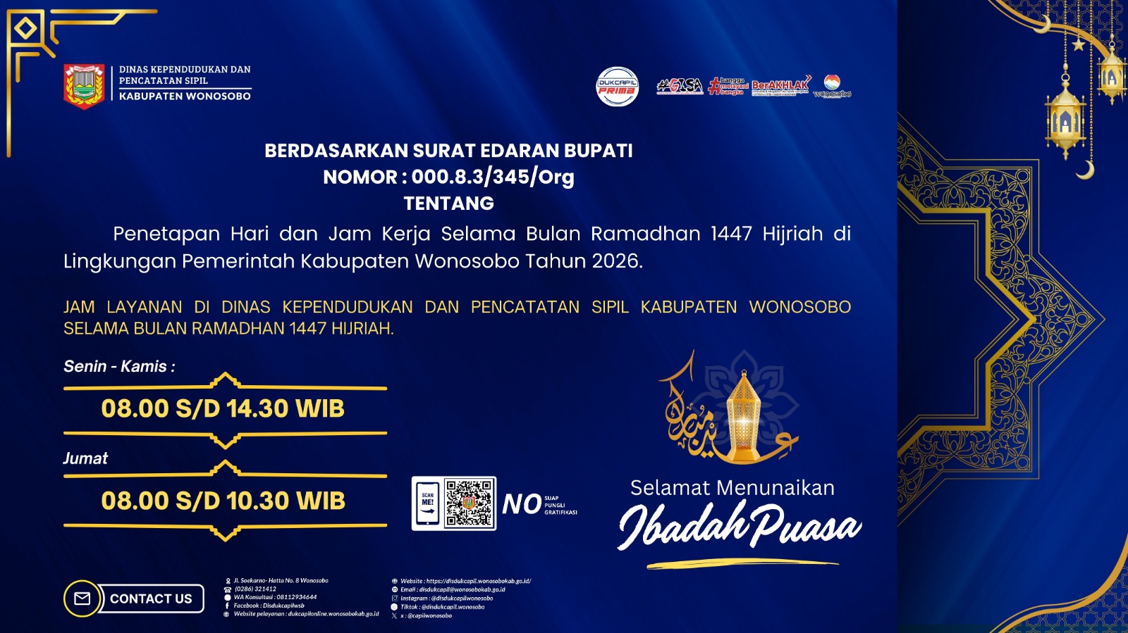 Dinas Kependudukan dan Pencatatan Sipil Kabupaten Wonosobo menyesuaikan jam pelayanan selama Bulan Suci Ramadhan 1447 H sebagai berikut: