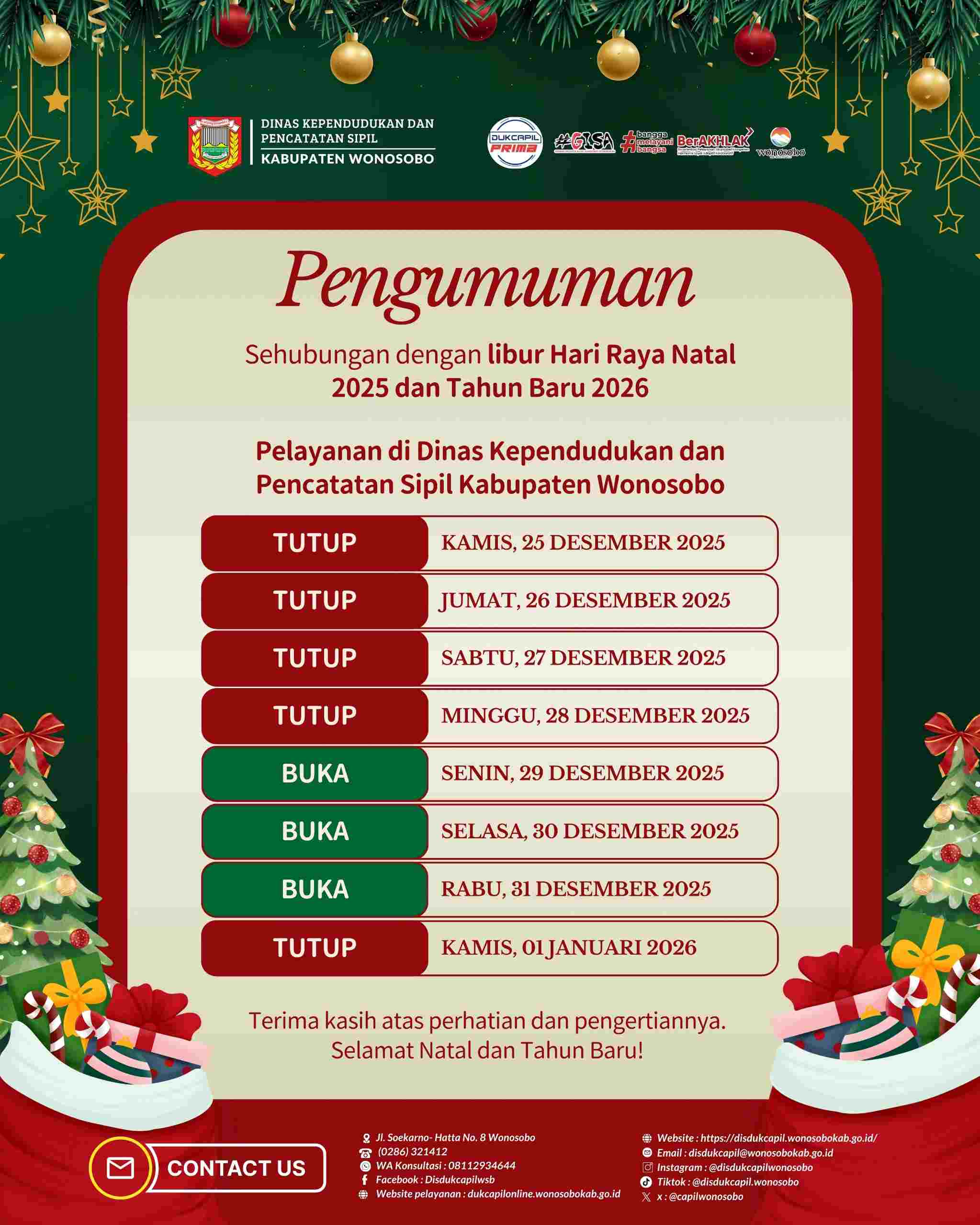 Pengumuman Jadwal Pelayanan Selama Libur Natal Tahun 2025 Dan Tahun Baru 2026